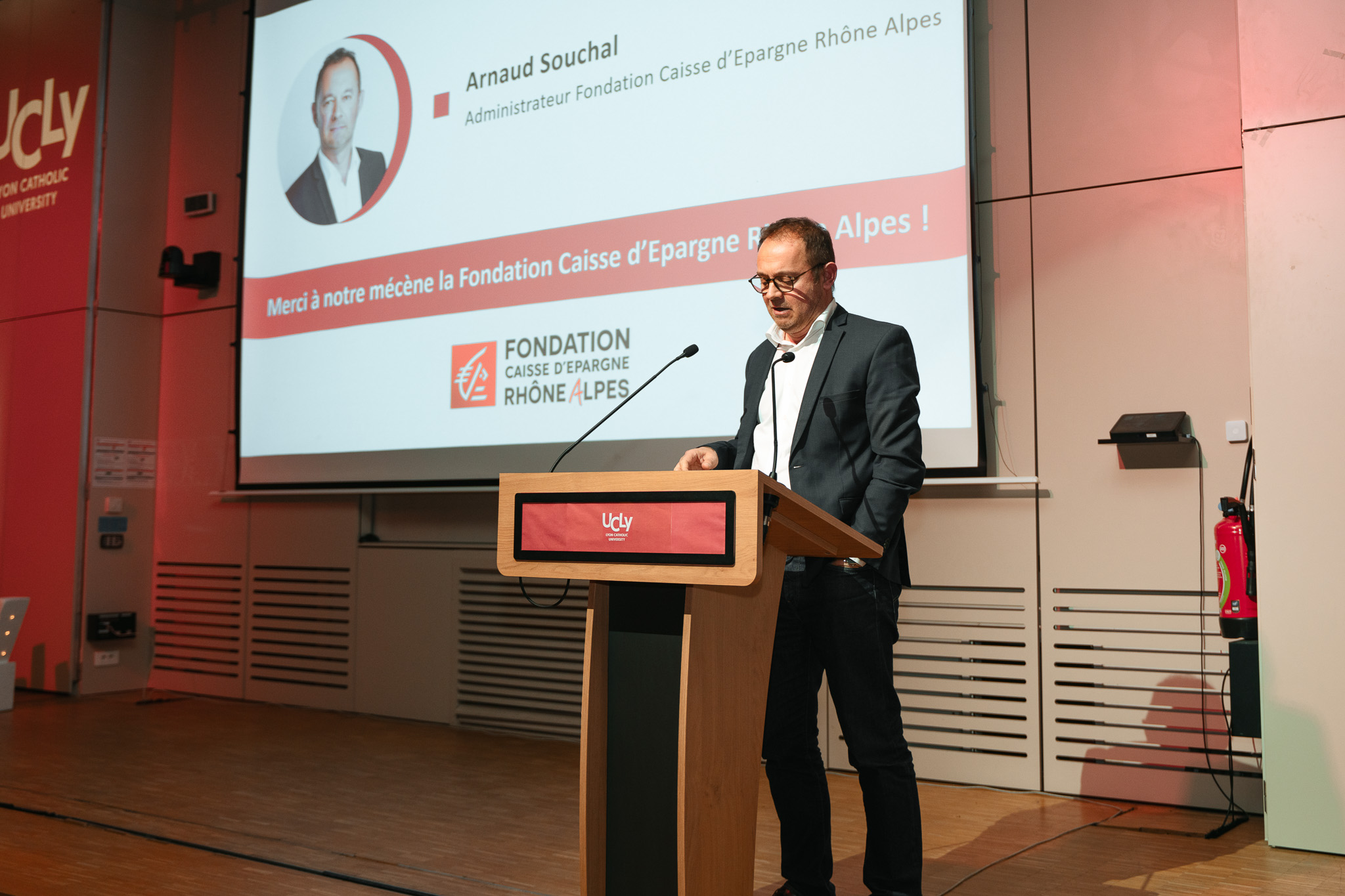 La soirée a débuté par la cérémonie de remise des bourses étudiantes, moment symbolique organisé chaque année pour valoriser les étudiants boursiers. Aux côtés de leurs familles, ils ont pu faire connaissance de celles et ceux qui soutiennent ce dispositif d’égalité des chances. Une vingtaine d'étudiants ont ainsi reçu leurs attestations des mains d'Arnaud Souchal, administrateur de la Caisse d'Épargne Rhône Alpes, l’un des mécènes engagés aux côtés de l’UCLy et de nos étudiants.