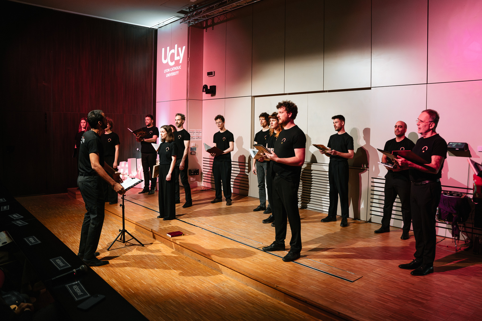 La soirée s'est poursuivie avec le concert Récit(s). Musique vocale, paroles et poésies, proposé par l'ensemble vocal InChorus sous la direction de Pascal Adoumbou. 12 choristes ont invité le public à se plonger dans les mots d’Aragon, Eluard et du poète argentin Guastavino… Ce concert faisait écho aux 150 ans de l’UCLy, une ouverture en forme d’hommage, un jardin féérique dessiné par Maurice Ravel dont nous fêtons les 150 ans cette année… Également, des œuvres oubliées de Charles-Marie Widor, compositeur lyonnais qui tenait la tribune de l’orgue de St François de Sales, lui aussi, il y a 150 ans…